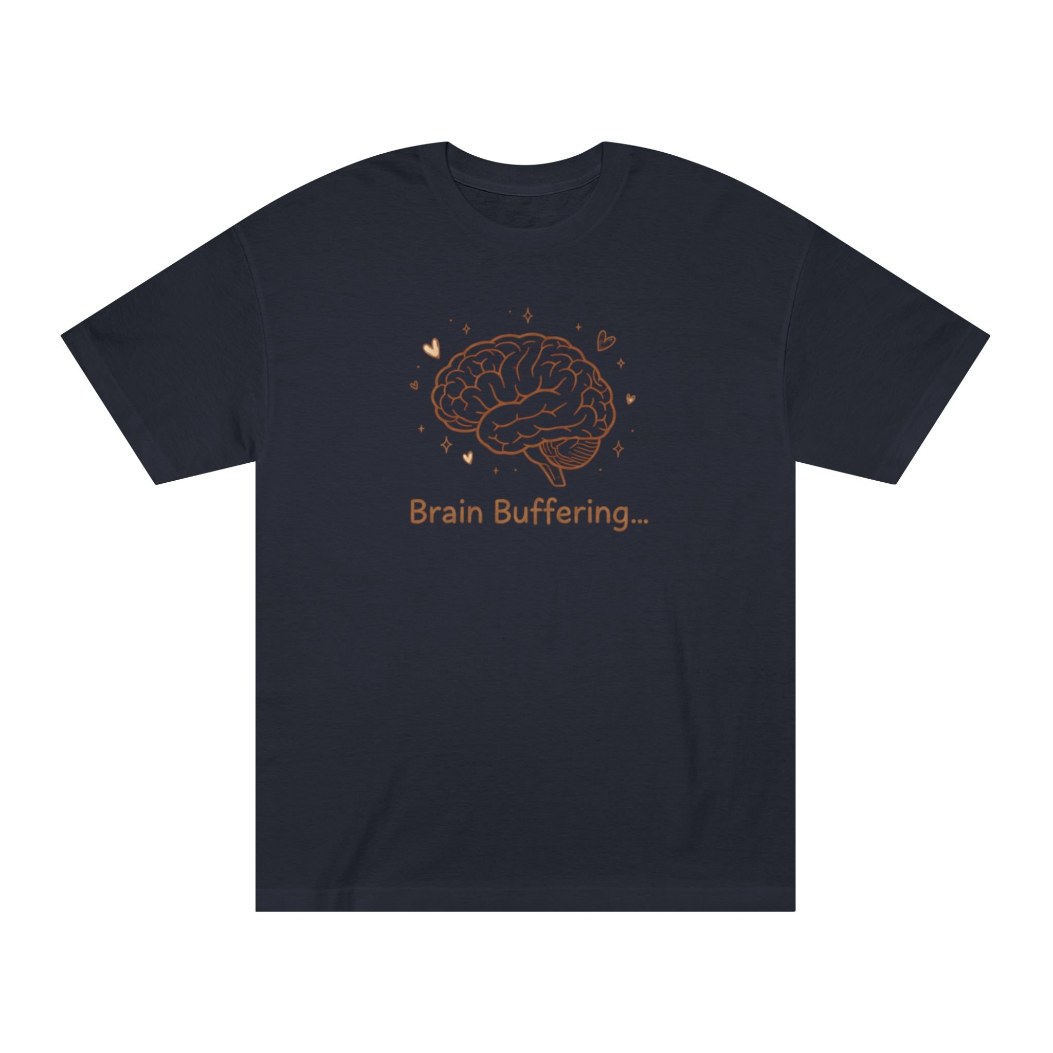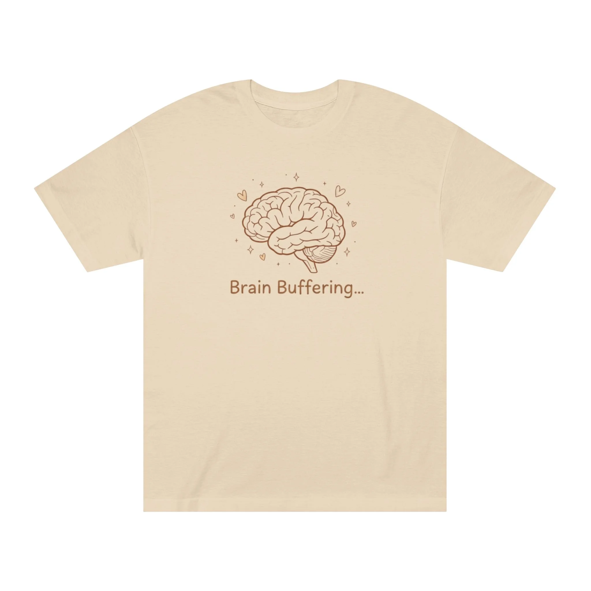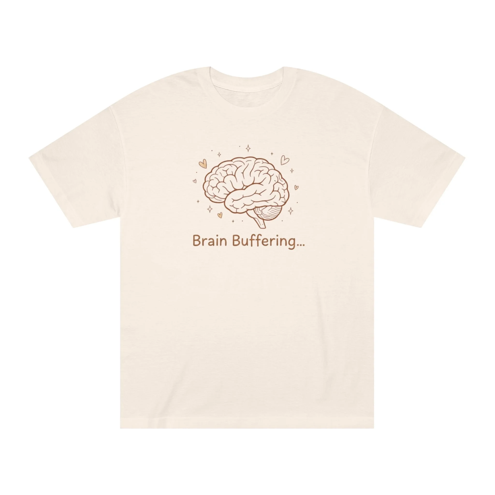Soft, thoughtful, and quietly funny — this classic tee wears like an old favorite while speaking to the small, everyday pauses we all feel. A delicate brain illustration rests over the chest with the text “Brain Buffering…”, a gentle nod to those moments when thoughts need a second to catch up. The medium-weight cotton drapes comfortably from a relaxed, classic fit, while ribbed collar and reinforced hems keep the silhouette tidy after many wears and washes. It’s the kind of shirt you reach for when you want to stay cozy, look low-key clever, and give a knowing smile to the people who get the joke.