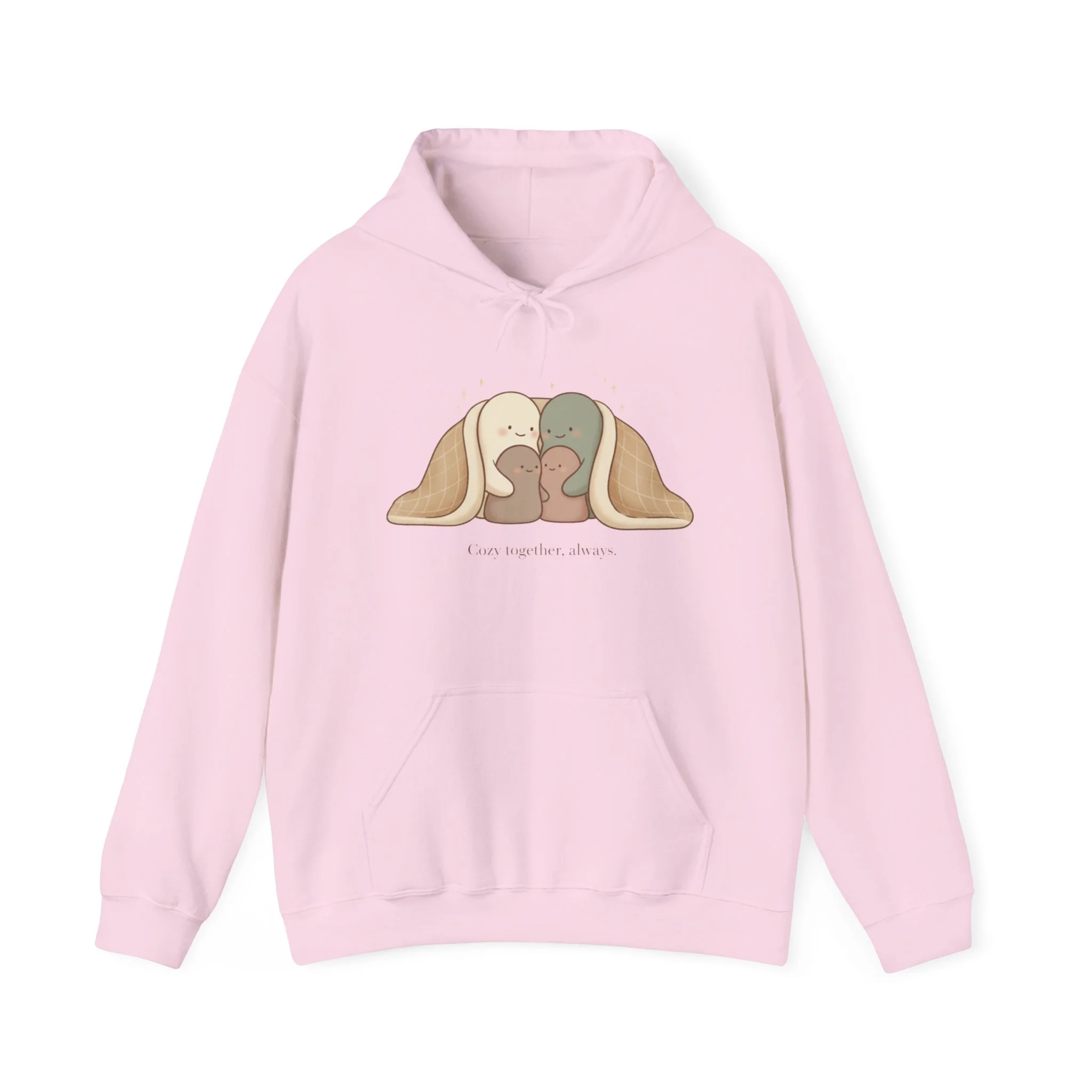 A cozy, softly styled hoodie that feels like a quiet hug. The gentle illustration of three cuddled figures in warm, muted tones sits low on the chest, inviting calm and connection. Wear it on slow mornings, while running errands, or curled up with a book — it brings a peaceful, comforting presence without shouting for attention. The roomy kangaroo pocket and double-lined hood add practical warmth, while the clean, minimalist print keeps the look understated and sweet. Ethically sourced cotton and durable construction mean this hoodie will be a reliable companion season after season.